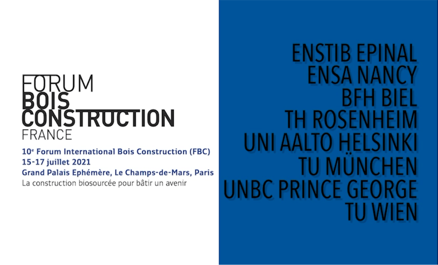 La 10e édition du Forum International Bois Construction se tiendra du 15 au 17 juillet 2021 au Grand Palais Ephémère, sur Le Champs-de-Maris à Paris. Un événement exceptionnel, réunissant la filière forêt-bois-construction autour de la thématique : La construction biosourcée pour bâtir un avenir.