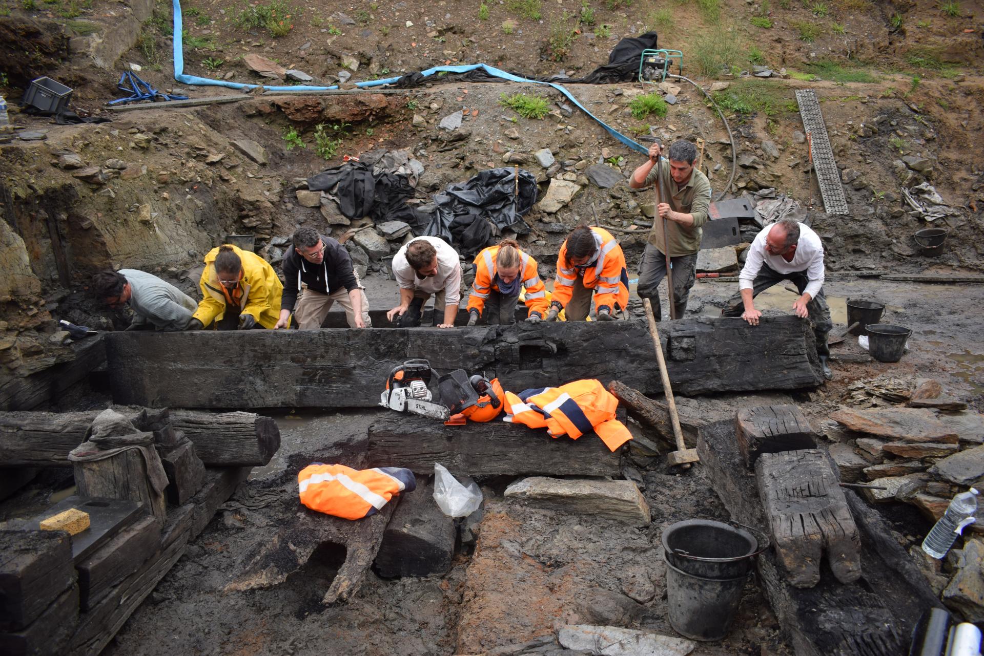 La parcelle fouillée cet été se situe en bordure d’un ancien bras de la Loire aujourd’hui disparu, d’un coteau rocheux et de la plaine alluviale. Les structures portuaires les plus anciennes, datées du courant du Ier siècle après J.-C., renvoient à des aménagements de berges rares en Gaule Lyonnaise. Il s’agit notamment de constructions en terrasse proches de celles déjà reconnues dans la zone portuaire de Saint-Lupien. Elles apparaissent sous la forme de murs et de caissons de poutres de bois et de dalles de schiste qui constituent des plates-formes techniques de chargement et déchargement. La conservation remarquable des matériaux organiques révèle une architecture exceptionnelle. Elle se caractérise par un assemblage de poutres de chêne pouvant atteindre jusqu’à 10 m de longueur et supportant des poteaux et des contre-fiches. Leur démontage minutieux a permis de relever les multiples techniques d’assemblage (tenon et mortaise, mi-bois, clous…), mais également d’observer les nombreuses traces laissées par les charpentiers (traces d’outils, marques, estampilles…). Cette architecture de bois est renforcée par un blocage aménagé de dalles de schiste, ainsi que par la construction d’un mur dans lequel une partie des poutres vient s’insérer. Ce dispositif de caissons est complété en arrière par la construction de murs de terrasses délimitant un espace de circulation.