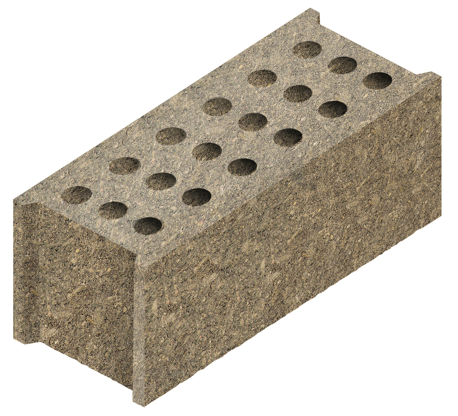 Ce bloc de construction jusqu’à R + 2 est réalisé à partir du bois recyclé des palettes consignées usagées du groupe Alkern. Puits de carbone emprisonnant le CO2, son taux d’incorporation de matière biosourcée est de 28 kg/m² de mur. Résistance à la compression de classe L30 ; R = 0,85 m².K/W ; résistance au feu REI de 240 min sous 175 kN/ml ; affaiblissement acoustique Rw + Ctr = 50 dB (mur nu)/64 dB (100 mm LdV)/60 dB (120 mm LdB)].