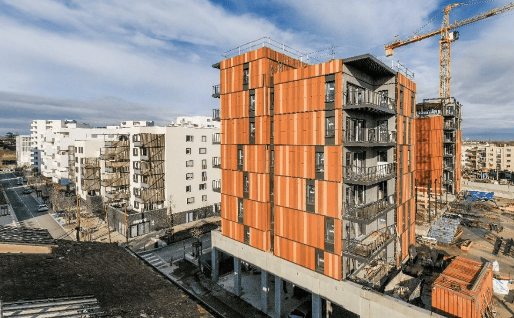 A Toulouse, cette opération de grande envergure, composée notamment d’une tour de 30 mètres en R+10 : le complexe immobilier Wood’Art / La Canopée, signé Dietrich | Untertrifaller Architectes en collaboration avec Seuil Architecture, en R+10 (31 mètres de haut) réalisée à 76% bois (ossature et plancher) représente l’un des plus importants projets grande hauteur édifié en bois à ce jour en France. Initié par ADIVBOIS et opéré par OPPIDEA, ce complexe immobilier ultra performant au plan environnemental ne constitue pas uniquement une démonstration technique : son modèle constructif innovant réunit tous les ingrédients pour être reproductible. Construit sur 100% de sa parcelle, ce projet aux volumes compacts aurait pu laisser craindre une massivité écrasante et brutale. Grâce à l’imagination débordante de ses concepteurs, c’est au contraire avec une légèreté déconcertante et une fantaisie savamment dosée que l’opération s’inscrit dans son environnement. Une prouesse architecturale obtenue à travers un ingénieux jeu de découpage et d’épannelage des bâtiments en R+5, R+8 et R+10, ainsi qu’à une audacieuse écriture en façade. “Nous avons imaginé une seconde peau de lamelles de terre cuite qui apporte un effet rassurant, enveloppant, protecteur en même temps qu’elle offre une image vivante et vibrante aux bâtiments”, explique l’architecte autrichien Michael Untertrifaller. “La terre cuite collait parfaitement à la variation que nous recherchions”, ajoute Philippe Goncalves de Seuil Architecture. “Il a fallu relever de nombreux défis techniques, se souvient Philippe Bontemps, responsable R&D, bois et bas carbone au bureau d’étude Terrell. La maîtrise de la sécurité incendie, la stabilisation des tours ou encore l’étanchéité à l’eau font partie des sujets qui nous ont beaucoup mobilisés.” Car il y a peu de références réglementaires sur lesquelles s’appuyer pour mener à bien ce projet bois XXL très novateur. “A titre d’exemple, lors de la conception en 2017, le DTU 31-4 qui encadre la mise en œuvre des façades à ossature bois n’existait pas encore”, indique l’ingénieur. Il a donc été nécessaire de multiplier les avis de chantier. ”Terreal a été identifié très tôt dans le projet, dès la phase concours afin de pré-valider les hypothèses techniques, notamment sur la mise en œuvre des panneaux de terre cuite en façade qui dépassent les hauteurs réglementaires.”