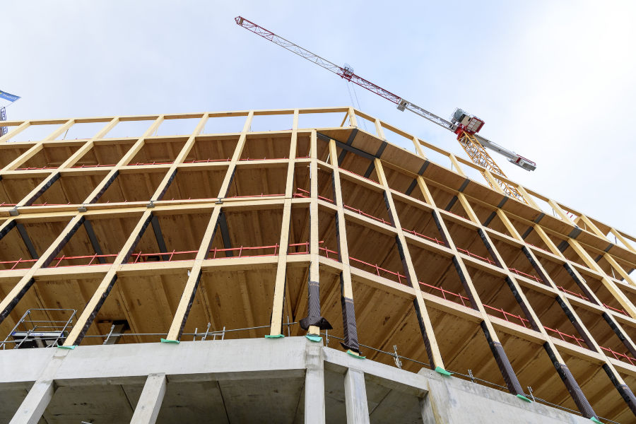 Photo : Construction par Matis de la structure bois de Green Office Enjoy. ZAC Clichy Batignolles. Bouygues Immobilier. 75017 Paris. 23 juin 2017